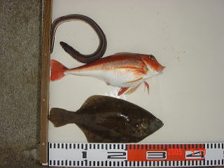 @釣れた魚 ハモ、ホウボウ?カレイ D釣れた日 5月29日 Eシューマッコさん F釣れたポイント 宮城県 G鰈1匹・ホウボウ?1匹・ハモ1匹でした。最後のトドメにハモが来て仕掛けをグッチャにされ、さらに酔いが回り仕掛けを片付け船上のマグロ状態に・・・っう感じでした〜 ヒラメオンリーより 昨日は確かに天気予報より波が高かったですよ。下を見ると私も酔います。写真で見ると小さいですが、寸法をみると30cmオーバーじゃないですか。さぞ、引きもよかったでしょ。赤い魚はタラのようなホウボウのような変わった魚ですね。K,S殿より赤い魚はカナガシラという魚だそうですとアドバイスいただきました。ハモが今の時期釣れるとはびっくりです。もしかしてハモ丼にしたりして。おいしかったでしょう?。おお、よだれが・・・。 |