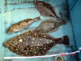 @釣れた魚 イシガレイ B使用したタックル サンゴのセット竿(一応カレイ用) C使用したエサ、ルアー エラコ&イソメミックス。 D釣れた日付 5月11日 13時位 E名前 Kさん F釣れたポイント 六ヶ浦と碁石の中間くらい G本人のコメント 初のイシガレイがコレ。運がいいだけっす(^^+イシガレイ54センチ、ヒガレイ34センチ、アイナメは見て通り・・・ ヒラメオンリーより うぉ〜でっけえ。竿折れませんでした? ヒラメじゃないの?30cmオーバーのアイナメがかわいく見える〜。大野湾にもすごいのがいるねぇ。早く釣りに行かねば。 |