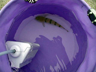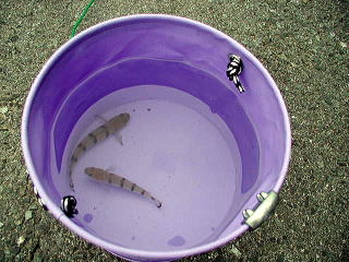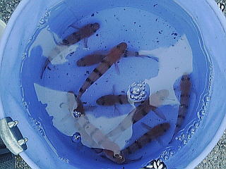 実家にイワシはないので、朝3:30には起き、急遽イケスの中をかき集め、バッカンに泡ブクを付けて、さらに酸素を発生する石を入れ、温度が上がらないようにペットボトルに水を入れて凍らせたものをバッカンに入れ、慎重な運転をして実家まで1時間をかけて持って行きました。