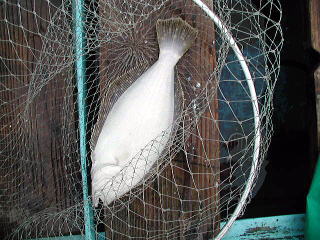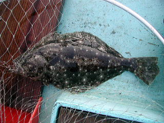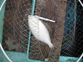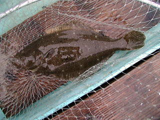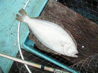大物がなかなか来ないので、イケスの中に入っている一番大きいイワシを使ったら、ヒラメ特有のアタリがあり、慎重なやり取りの末、リリースサイズが釣れました。