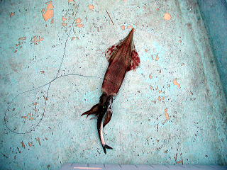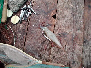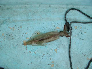 このイカを釣った後、イワシを投入したらすんなりと底に付いたので、このヤリイカがイワシをいたずらしていたようです。