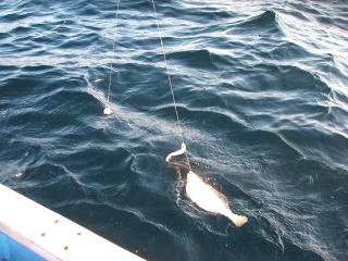 ロッドが一気に下がった所をアワセて上の写真のも35cmほどのヒラメが釣れました。