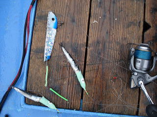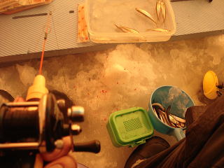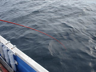 その後、正午ころまで何も釣れなくて、しばらくしゃくっていると、シャクっている途中で糸ふけが出て、三角バケが止まったようです。
