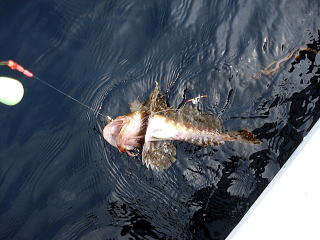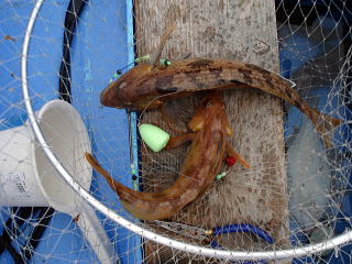 リールを巻いていてもラインが出されるので、さらに大きなサイズかなと巻き上げてくると・・・珍しいアイナメのダブルでした。