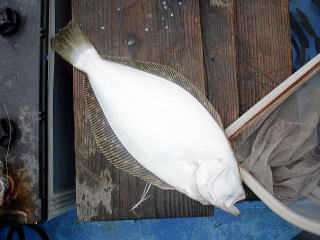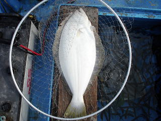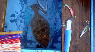 1時間ぐらいタナに注意しながらシャクっていると、午後6時ごろに待望のアタリがあり、バレないように祈りながら上げてくると、42cmのヒラメが釣れました〜。