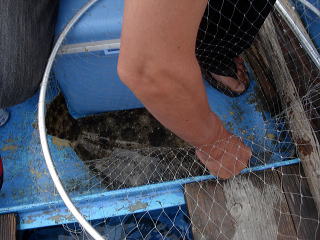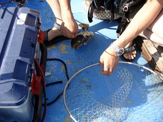 手でラインを引っ張ってもなかなかあがってこなくて、イカが水面に見えたときは、船の上は水をかけられたりスミをかけられたり・・・仕掛けもちょっとオマツリ気味になったりとうれしい忙しさでした。