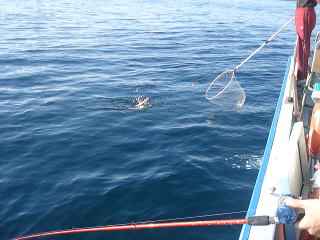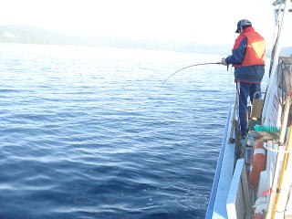 午前7時頃には、船尾でまた、Mくんが釣ってリードを広げています。