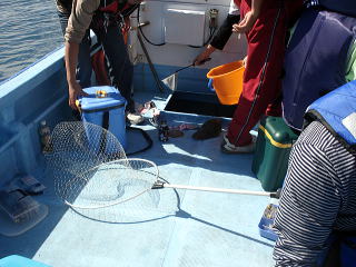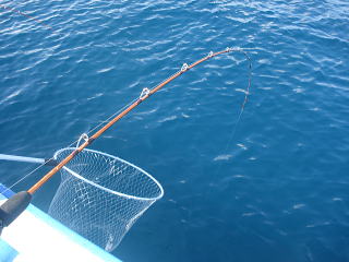 船尾のほうでMくんが本日最大の40cm近いサイズを釣り上げました。