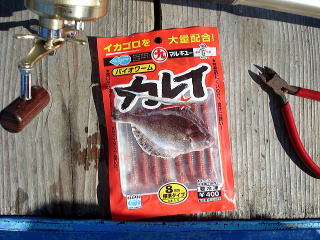 あまりエサを大きく付けるとエサになりそうもないデカイ、ラグビーが釣れるので、欲しいサイズが釣れるように小さめにちょん切って付けます。