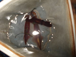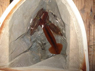 仕事の時間が迫っているので、7時のチャイムと同時に仕掛けを回収してくると、水中ライトを船に上げた瞬間にドスッと乗って、もう1ハイ釣れました。