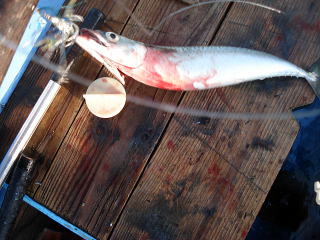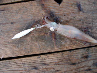 追い乗りを期待しながらゆっくり上げてくると、1ハイ、胴長15cmほどのヤリイカが釣れていました。