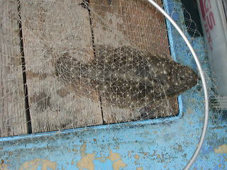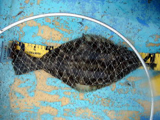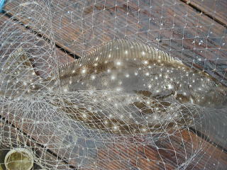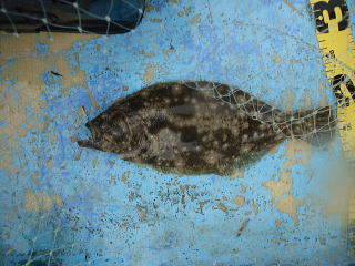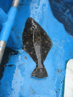 時折雨が激しく降ってくるため、6時でやめようとしたところ、アタリがあり、慎重にやりとりして、38cmのヒラメを追加しました。