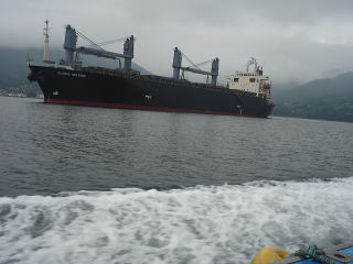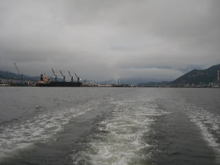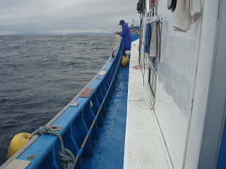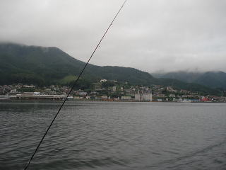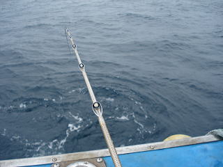 雨が降ってきたため、水深8mの場所だけちょっとやって帰ろうと思って、仕掛けを入れると・・・いきなり引っ手繰るようなアタリがあり、イワシを取られない様に、ロッドを海中に押し気味にしていると、一気に引きこむアタリに変わったためアワセたら、さらに引きこむ引きと、ラインがギュギュギューって出されました。