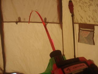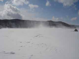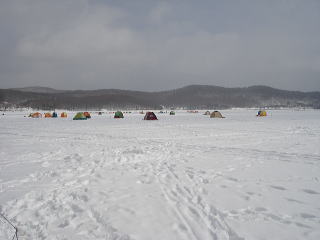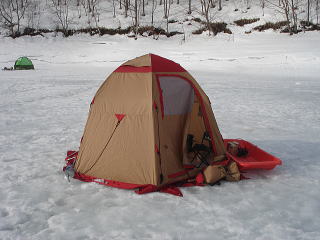念入りに魚探で穴を調べて、反応の良い場所を探していただき、テントを張ることができました。