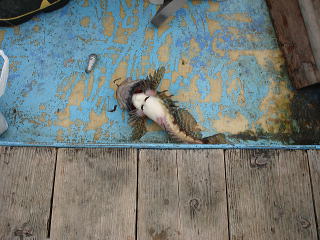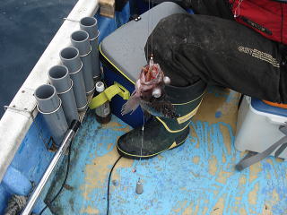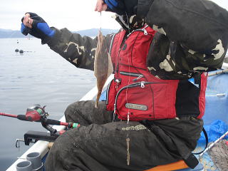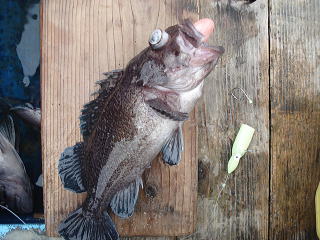 まず、最初にアタリがあったのは、私で「釣れたよ。この引きはソイだね・・・。」といって上がってきたのは、なんとカジカ・・・それもスレで、胸ヒレにかかってきました。