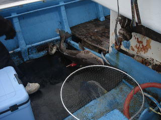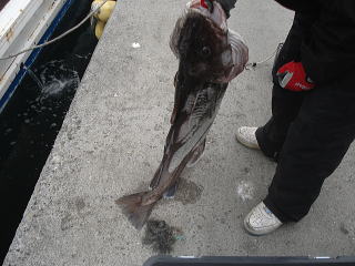 荒神丸船長さんがボカギで上げるとなんと巨大なタラが船内に上がってきましたよ。