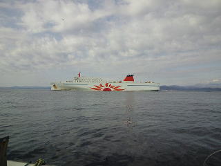 釣っているすぐそばをこんな大きなフェリーか走っていって、引き波で横揺れ~横揺れ~。