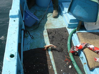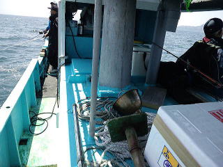 今朝、父親の網仕事を手伝ったら昨日のシケがうそのようにナギていたため、急きょ、約束していたガモちゃんを誘っての釣りです。