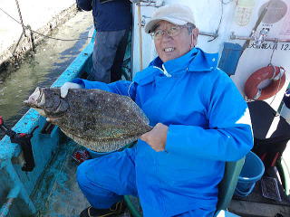最後の最後でデカいのが来たので、船頭としては、うれしい反面、風で途中で引き揚げて全員にいっぱいヒラメを釣らせられなくて、ちょっと不完全燃焼気味でした。
