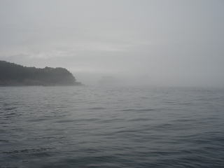 出航時間は霧がかかっていて、出発が危ぶまれましたが、GPSと見張りでなんとか行けそうだったので時間通りに出発です。