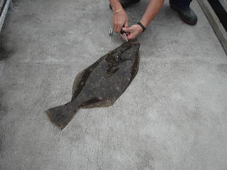 7時30分ぐらいに目的地に着いて、仕掛けを投入するとすぐ、トモ側のお客さんにヒラメが釣れました。
