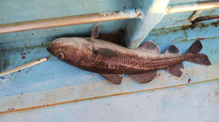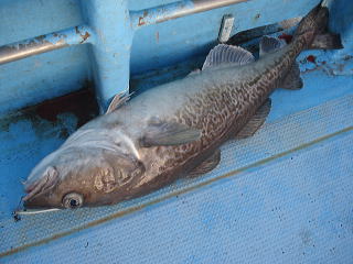 下の写真のタラは1mぐらいの大きさですが、こちらも底から巻き上げて止めた瞬間にガツンときて、ドラグをジーッ、ジーッとゆっくりと底に引いていく引きで、かなりの手ごたえがあって上がってくるまで10分ほど格闘しました。